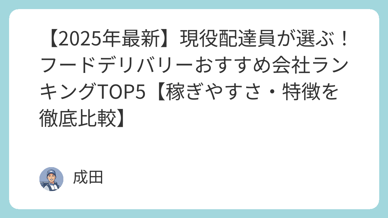 今回は、現役配達員である私が実際に稼働して感じた**「おすすめ順」**に、主要フードデリバリー5社をランキング形式で紹介します。 各社の「良い点」だけでなく、「ここがダメ」というリアルな本音も包み隠さず書きましたので、登録先の参考にしてください。